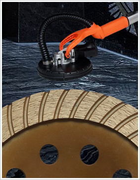 金刚石磨具, 是由金刚石刀头焊接或者冷压在金属基体上而成;金刚石刀头是通过人造工业金刚石和金属结合剂,冷压和热压烧结而成。金刚石磨轮通常被装在混凝土打磨机上来打磨如混凝土,花岗岩,大理石和其它的一些石材等。